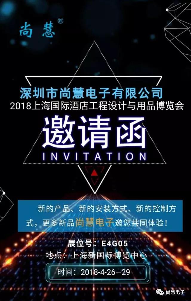 深圳市尚慧電子有限公司展臺(上海新國際博覽中心E4展廳G05展位),本次展會我們將為您帶來新的產(chǎn)品、新的安裝方式、新的控制方式,更多新品尚慧電子邀您共同體驗!