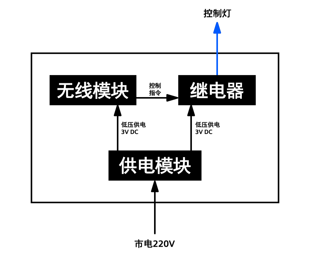 其核心組成部分為供電模塊、無線模塊和繼電器,無線模塊接收遙控器、手機APP、智能音箱等發(fā)出的指令,并將控制指令傳輸給繼電器,執(zhí)行開和關(guān)的操作。