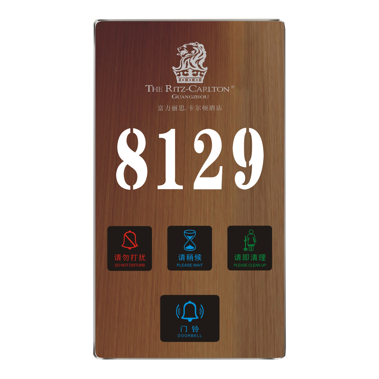 2、客人按下房間內(nèi)的"請勿打擾”開關(guān),液晶屏的"請勿打擾”圖案背光亮起,門外顯示屏中提示請不要打擾,此時門鈴按鍵不起作用。